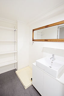 別注の洗面台と大きな鏡。